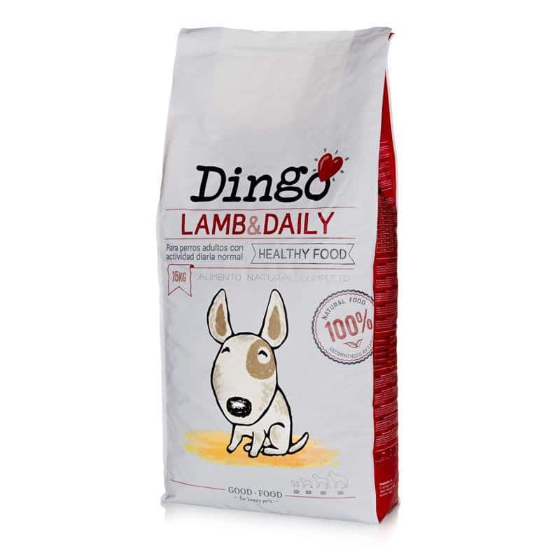 Dingo Lamb & Daily es una comida 100% natural que se elabora con ingredientes seleccionados para conseguir una combinación equilibrada de proteínas, grasas y carbohidratos, así como vitaminas y minerales. Contiene proteína de cerdo, de pollo y de cordero, además de guisantes, pulpa de manzana y una mezcla de romero y cítricos deshidratados. El pienso es rico en vitaminas del grupo B, como la B12 y la B6, y minerales como el hierro, el fósforo y el zinc. Es un alimento libre de subproductos y transgénicos que no utiliza aromatizantes ni colorantes artificiales, únicamente conservantes naturales.