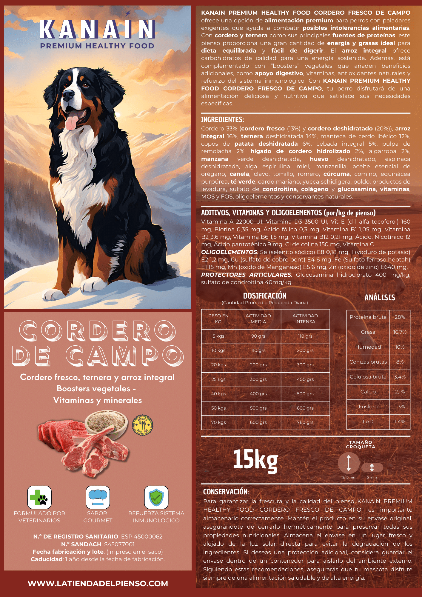 INGREDIENTES: Cordero 33% (cordero fresco (13%) y cordero deshidratado (20%)), arroz integral 16%, ternera deshidratada 14%, manteca de cerdo ibérico 12%, copos de patata deshidratada 6%, cebada integral 5%, pulpa de remolacha 2%, hígado de cordero hidrolizado 2%, algarroba 2%, manzana verde deshidratada, huevo deshidratado, espinaca deshidratada, alga espirulina, miel, manzanilla, aceite esencial de orégano, canela, clavo, tomillo, romero, cúrcuma, comino, equinácea purpúrea, té verde, cardo mariano, yucca schidigera, boldo, productos de levadura, sulfato de condroitina, colágeno y glucosamina, vitaminas, MOS y FOS, oligoelementos y conservantes naturales.