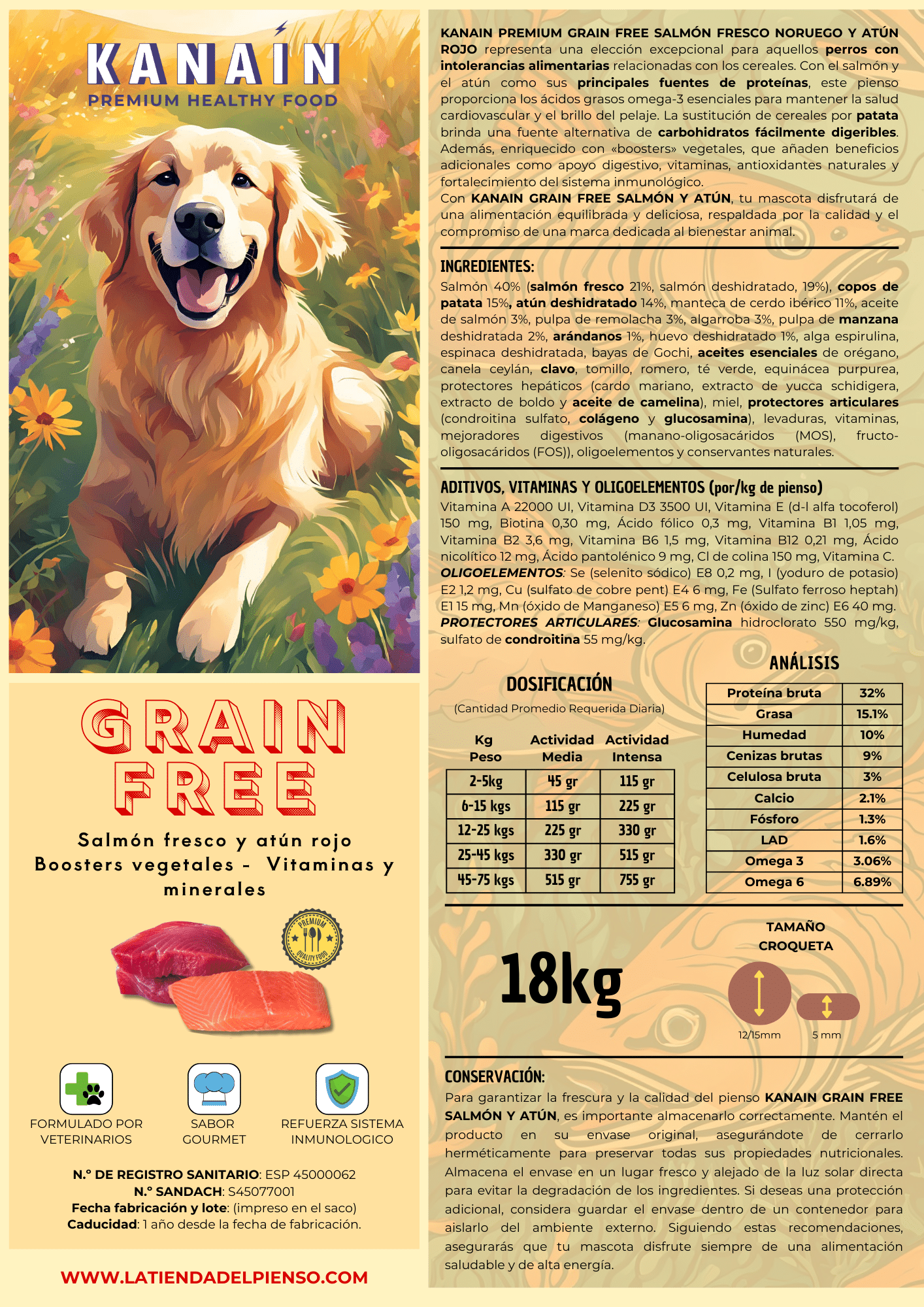 KANAIN Grain Free Salmón y Atún está especialmente formulado para perros que requieren una dieta sin cereales. Sustituye los cereales tradicionales por copos de patata, ofreciendo una fuente de energía más digestiva. Su fórmula incorpora salmón fresco (21 %) y atún rojo deshidratado (14 %), ricos en Omega-3, esenciales para el corazón, las articulaciones, la piel y el pelaje.