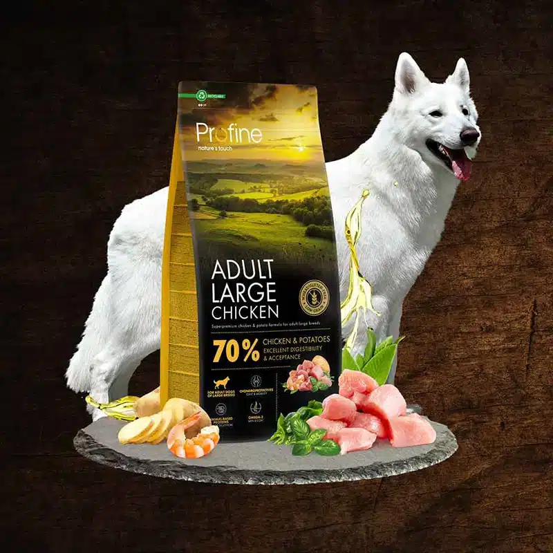 Nuestro pienso Profine Adult Large Chicken 12 kg está compuesto por pollo 40% (pollo deshidratado 22%, proteína de pollo 18%), patatas (22%), maíz manzanas deshidratadas, grasa de pollo (conservada con tocoferoles mixtos, fuente de vitamina E) (6%), levadura de cerveza, hidrolizado de hígado de pollo (2%), harina de gambas (1,5%), aceite de salmón (1%), algas marinas deshidratadas (0,5%), glucosamina (0.02%),raíz de achicoria (fuente de manano-oligosacáridos 0,018%), mezcla de hierbas secas (hinojo, albahaca, salvia 0.018%), fructo-oligosaccharides (0.012%), chondroitin sulphate (0.012%), Mojave yucca (0.01%), ceniza bruta 6,4%, calcio 1,5%, fósforo 1,0%.